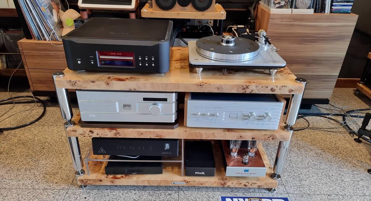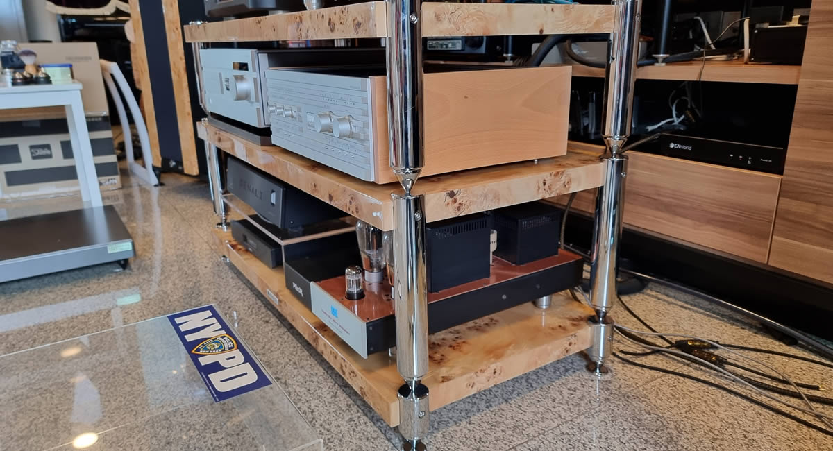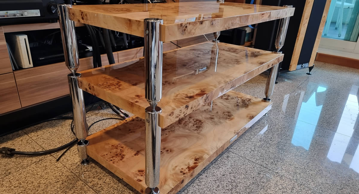 A recent installation of a beautiful Audio Philar rack in a customer's home. High gloss lacquer Birdseye maple wood shelves with solid stainless steel pillars - a truly outstanding combination!