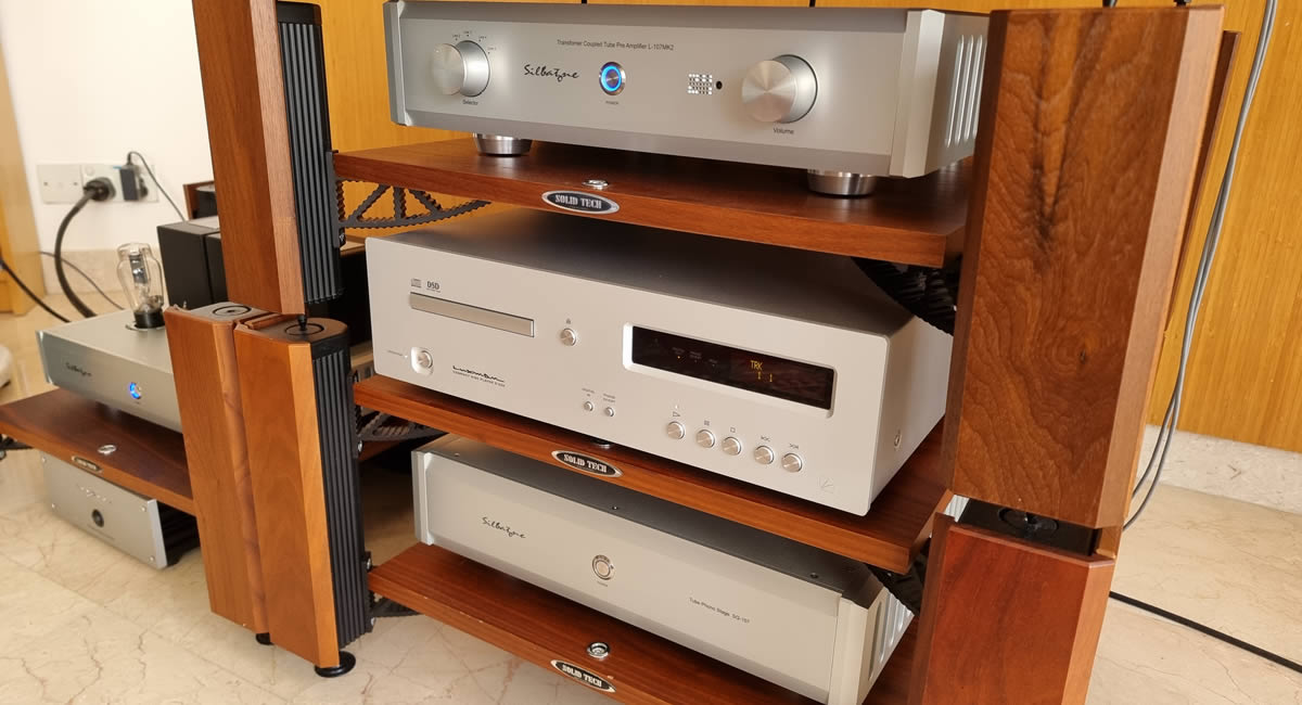 Complete Silbatone systerm consisting of SQ-107 phono stage, L-107 MK2 preamp and P-105 SET power amp, driving Horns Mummy speakers