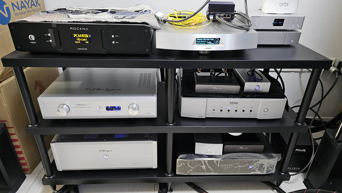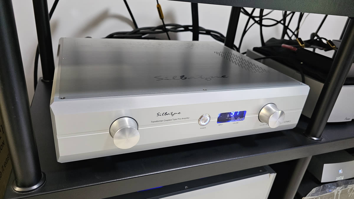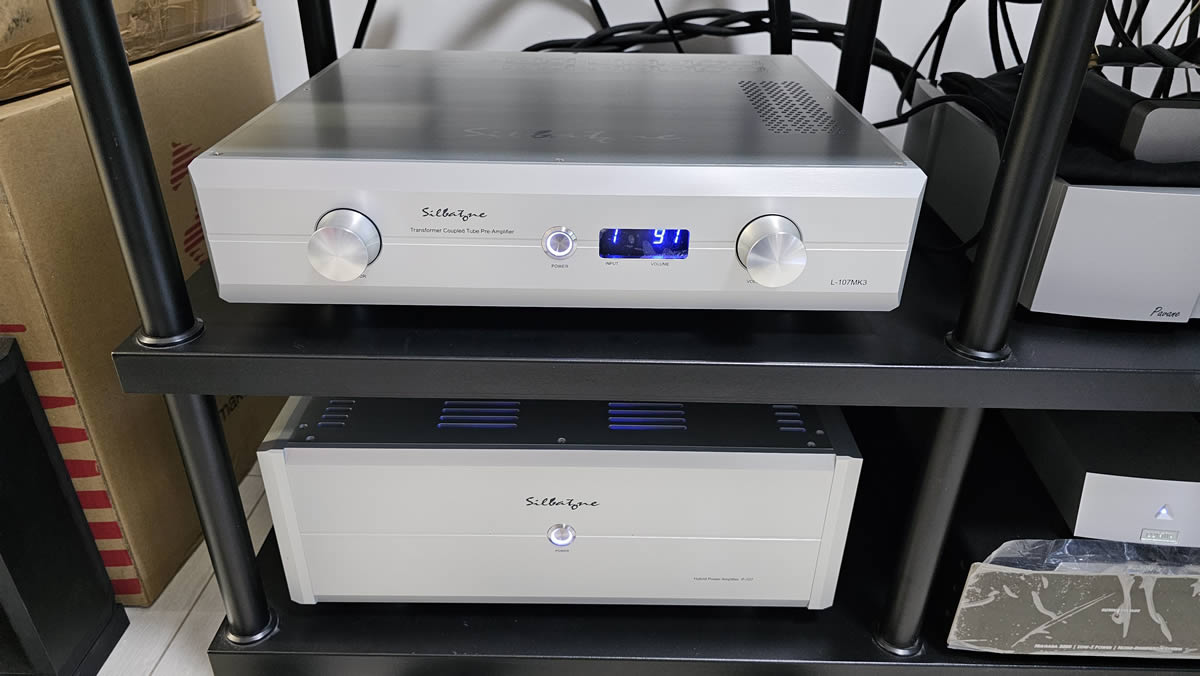 An interesting combination of Silbatone L-107 MK2 preamp and P-107 hybrid power amplifier driving a pair of Diptyque panel speakers. A combination of power and finesse in one package.
