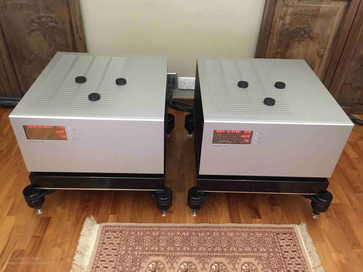 Closeup of the 701 monoblocks on Critical Mass Maxxum amplifier stands