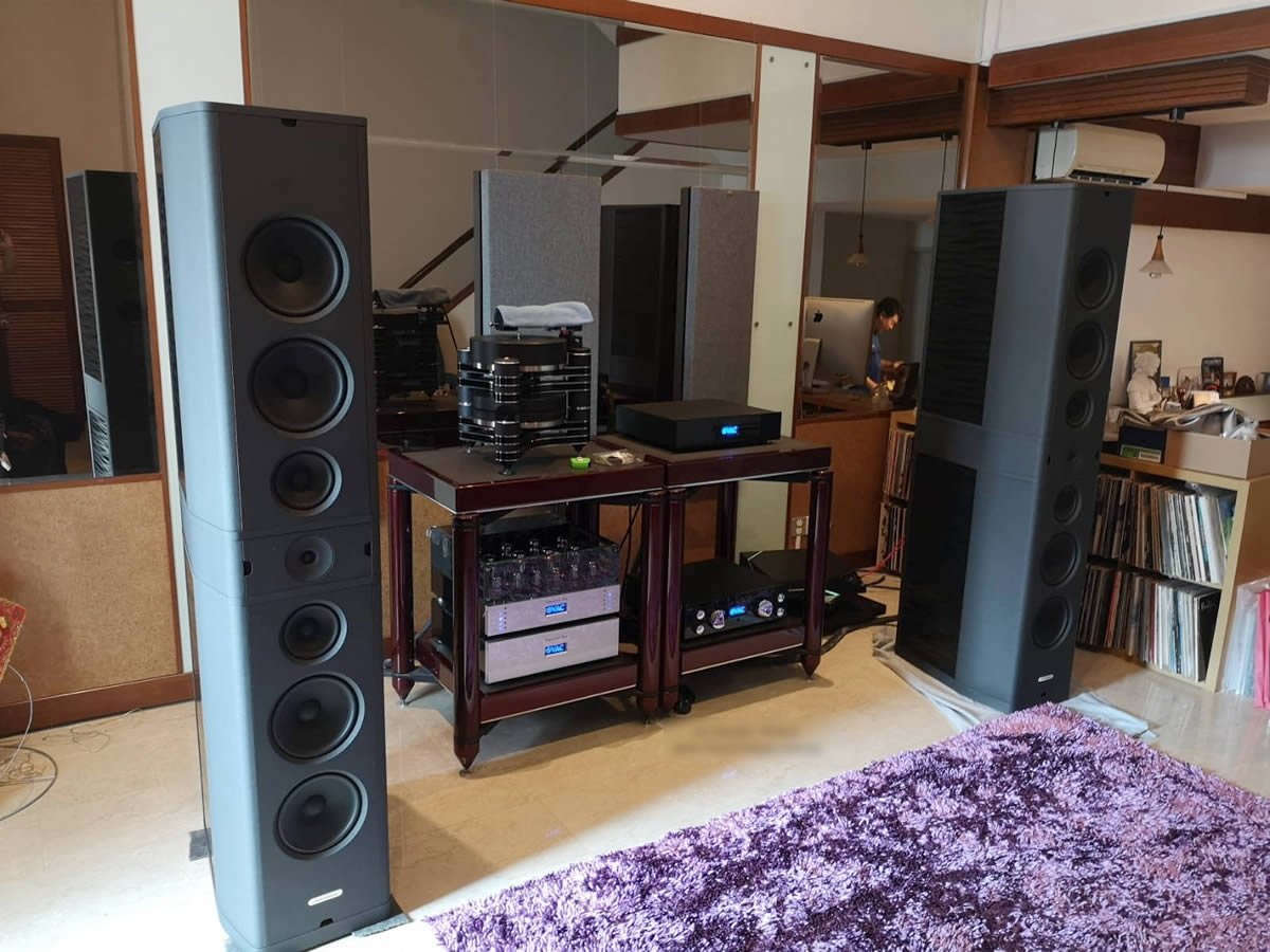 Audio Solution Figuro XL floor-standing speakers driven by VAC tube electronics, supported by Critical Mass Maxxum racks.