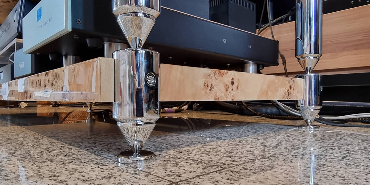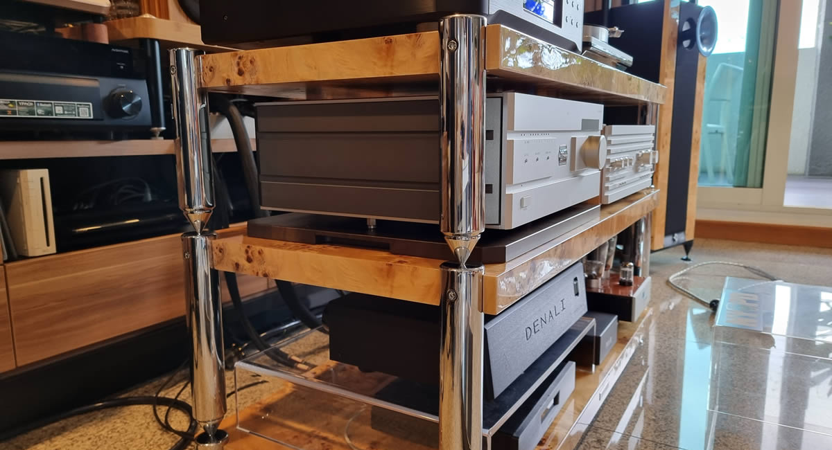 A recent installation of a beautiful Audio Philar rack in a customer's home. High gloss lacquer Birdseye maple wood shelves with solid stainless steel pillars - a truly outstanding combination!