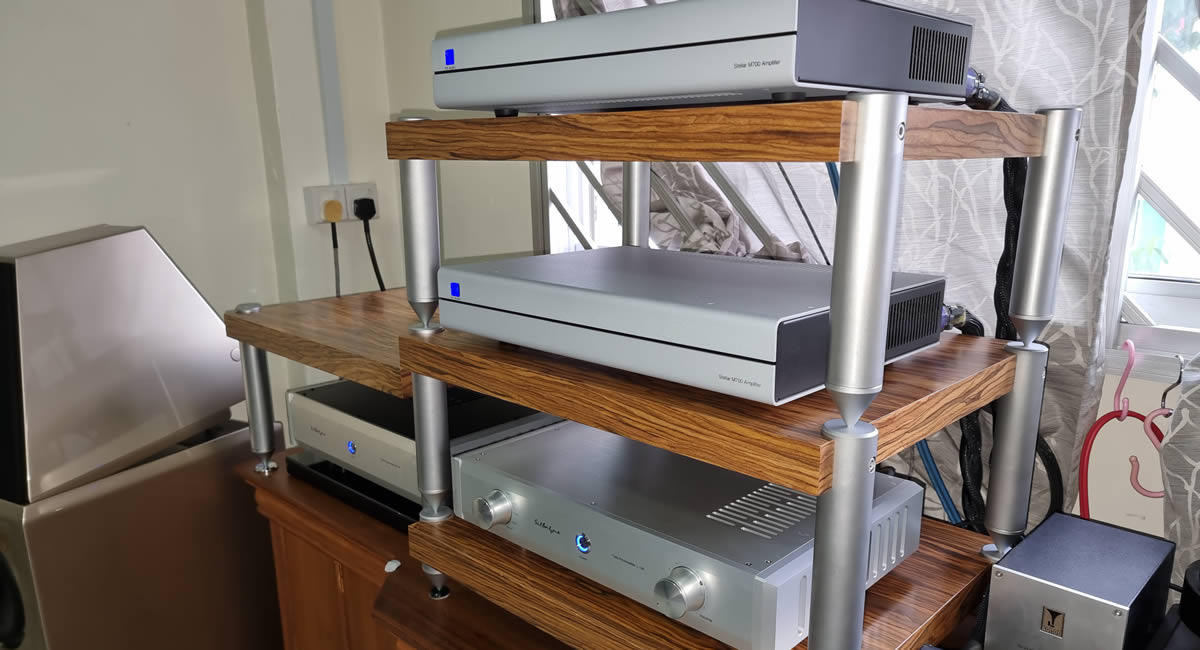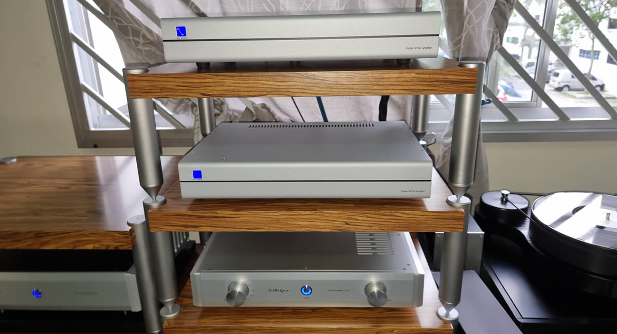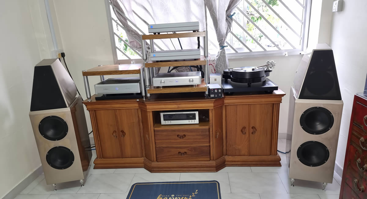 Just set up this audio system consisting of a TW Acustic Raven One/Reed 2A tonearm analogue frontend, Silbatone SQ-107 phono stage and L-106 preamp, with PS Audio M-700 monoblock driving Wilson speakers. All electronics supported on Audio Philar racks.