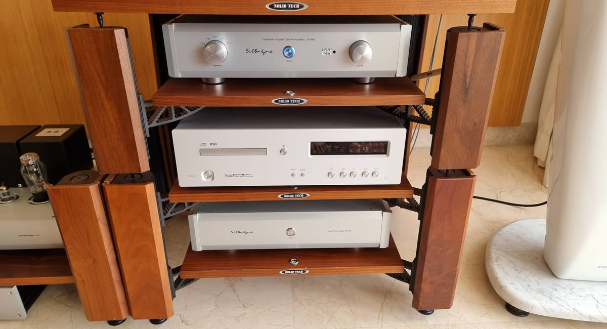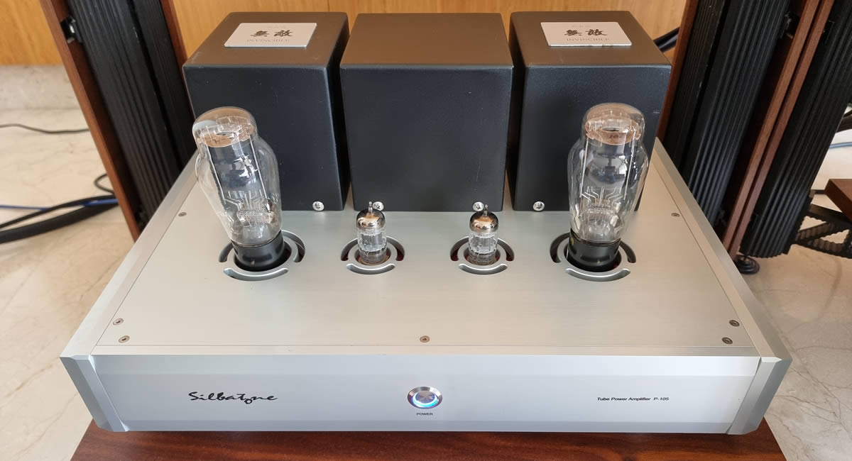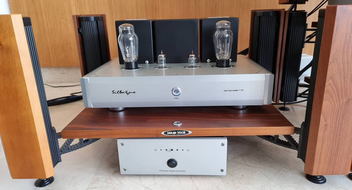 Complete Silbatone systerm consisting of SQ-107 phono stage, L-107 MK2 preamp and P-105 SET power amp, driving Horns Mummy speakers
