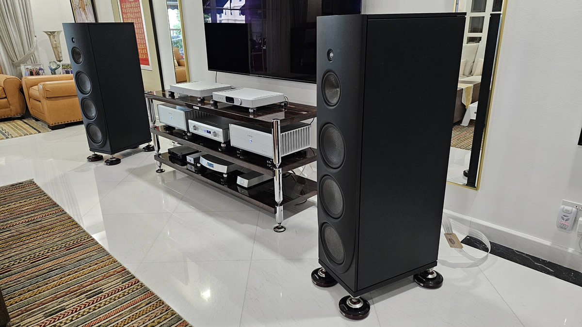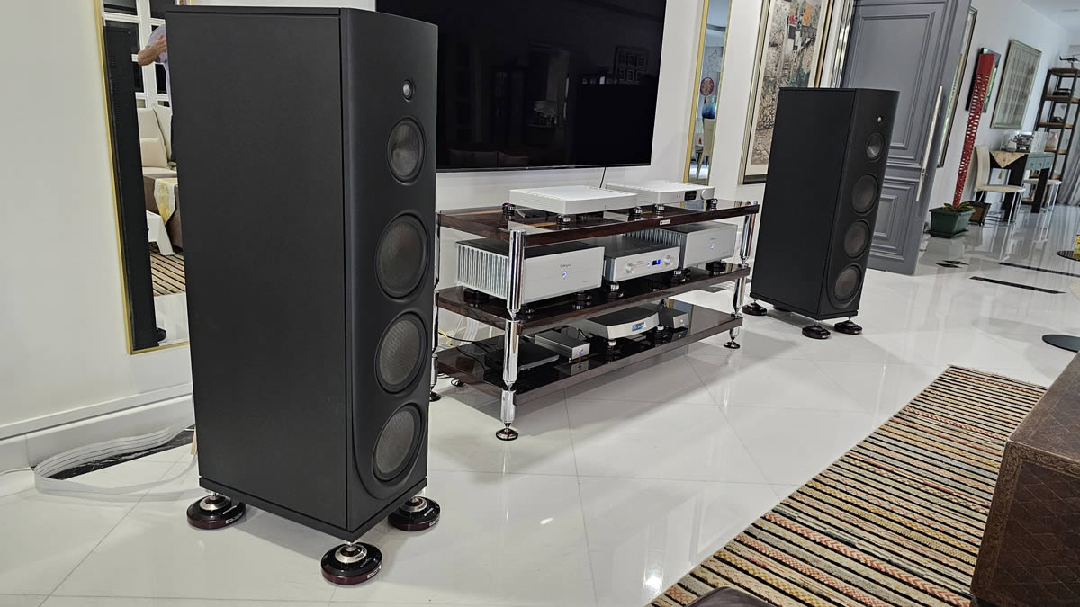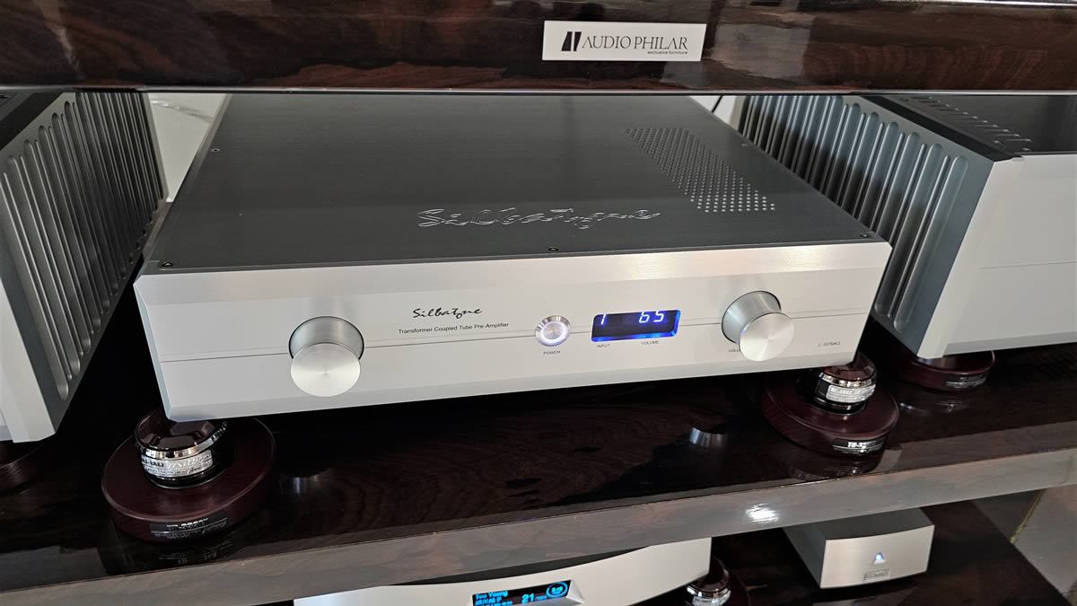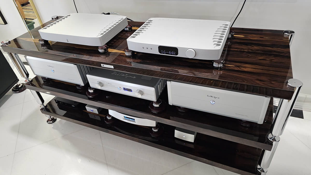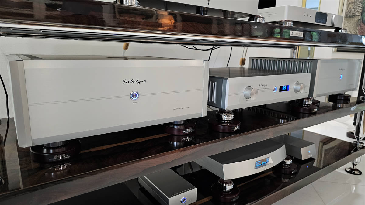 Silbatone latest L-107 MK3 preamp and P-107M monoblock power amps, driving Magico Q5 loudspeakers. System is also fully kitted out with Harmonix Million Series footers and isolation devices.