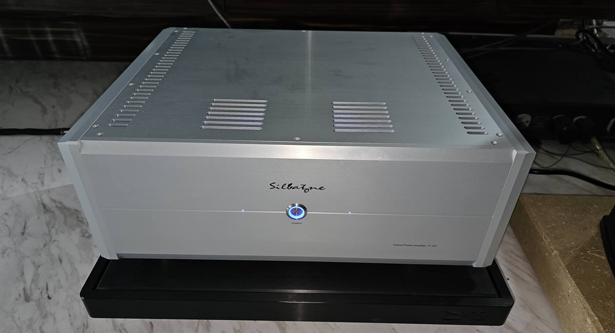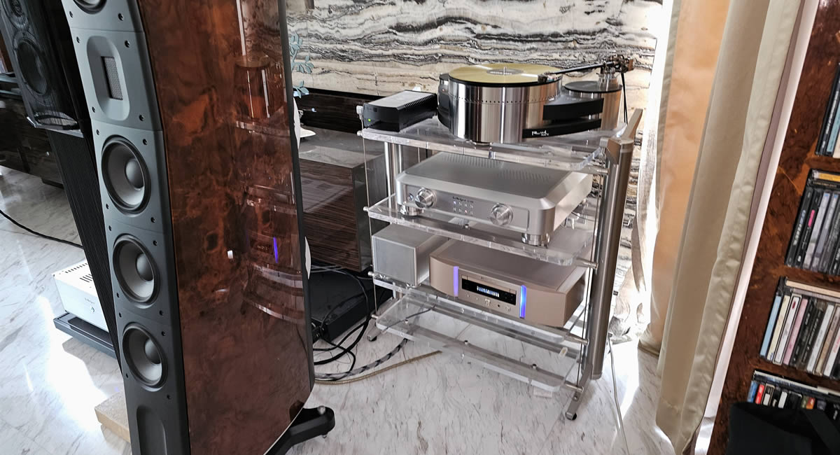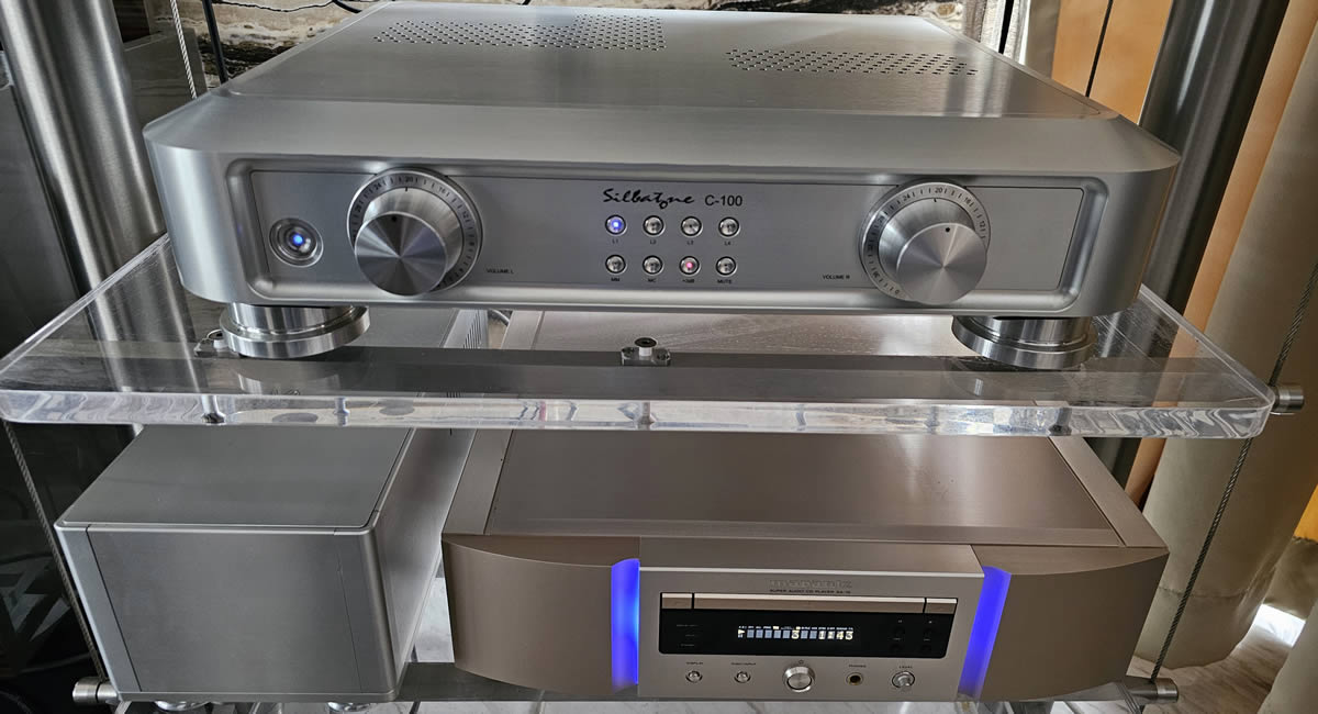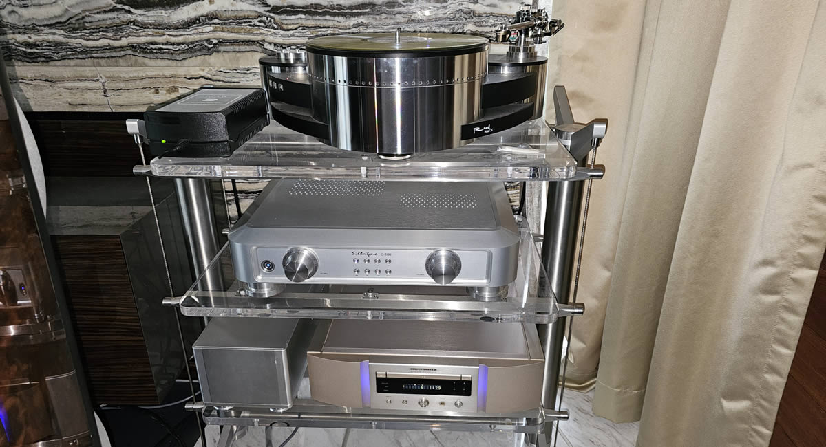 Silbatone combination of C-100 reference preamp and P-107 hybrid power amplifier driving Raidho D3.1 and Sonus Faber Guarneri speakers. Main source is the Reed Muse 3C and 3P turntable/tonearm combination.