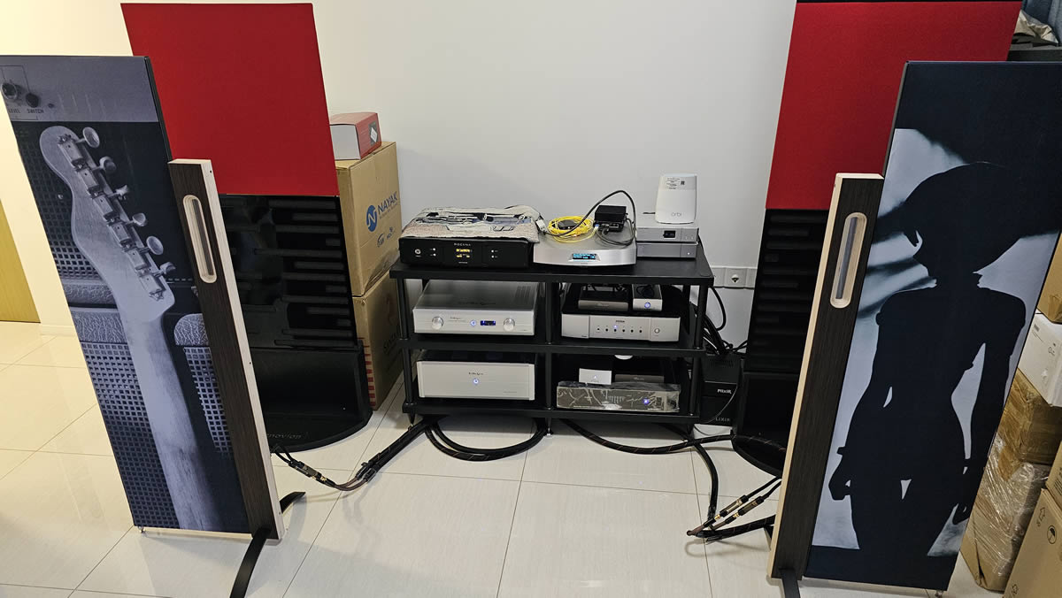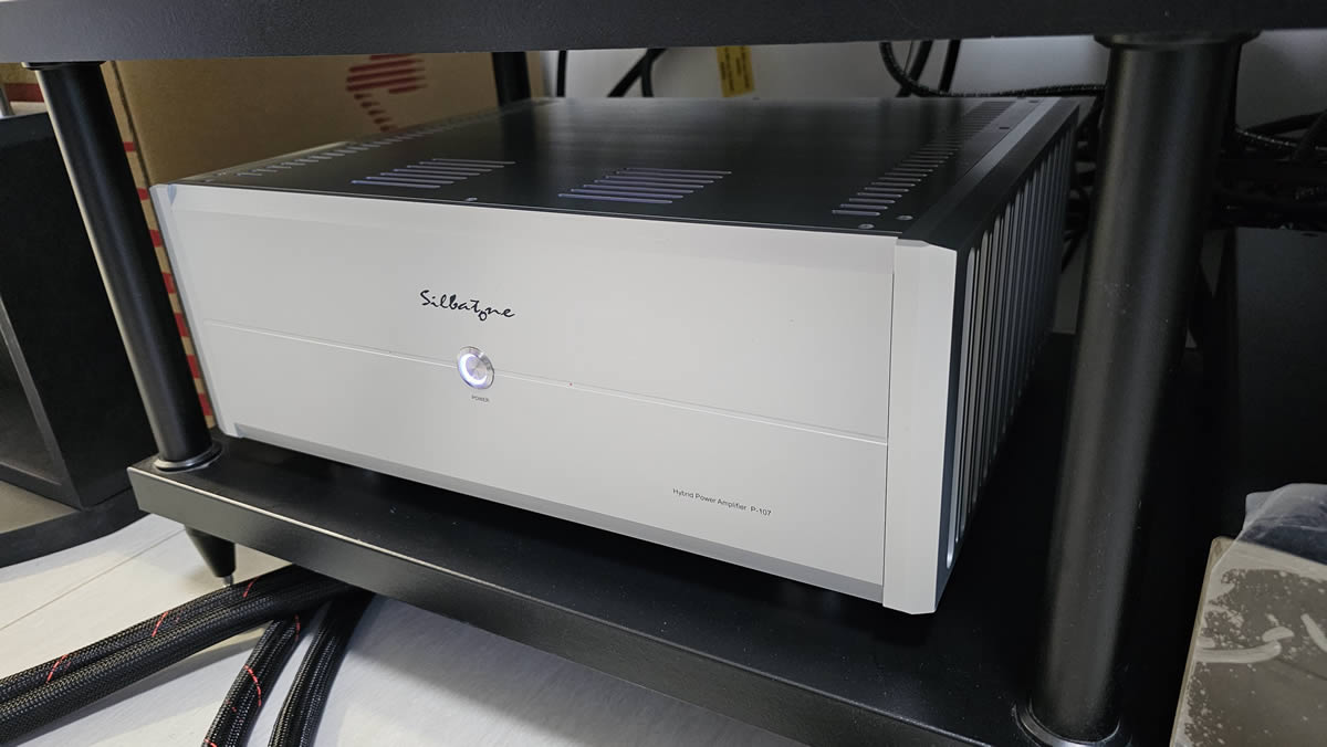 An interesting combination of Silbatone L-107 MK2 preamp and P-107 hybrid power amplifier driving a pair of Diptyque panel speakers. A combination of power and finesse in one package.